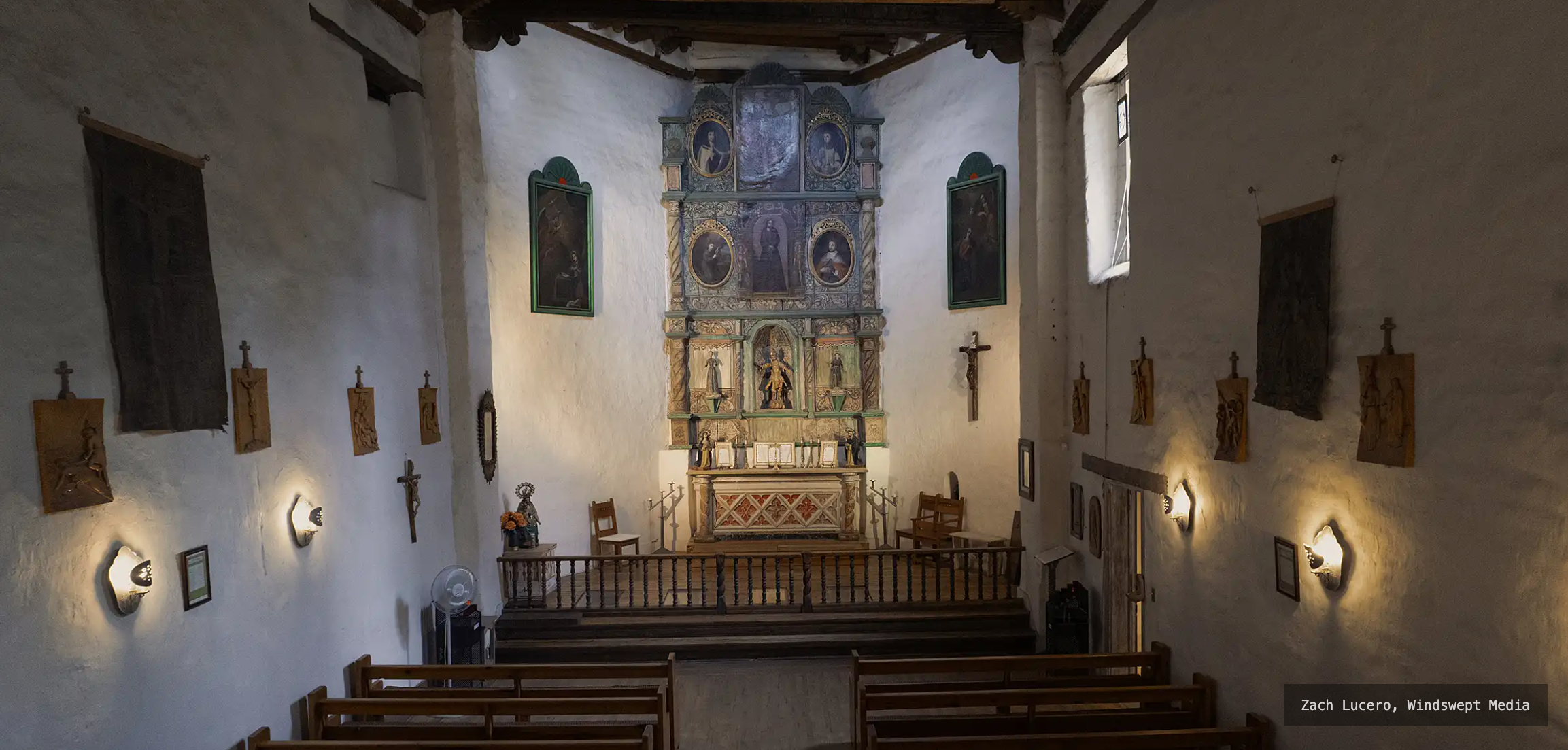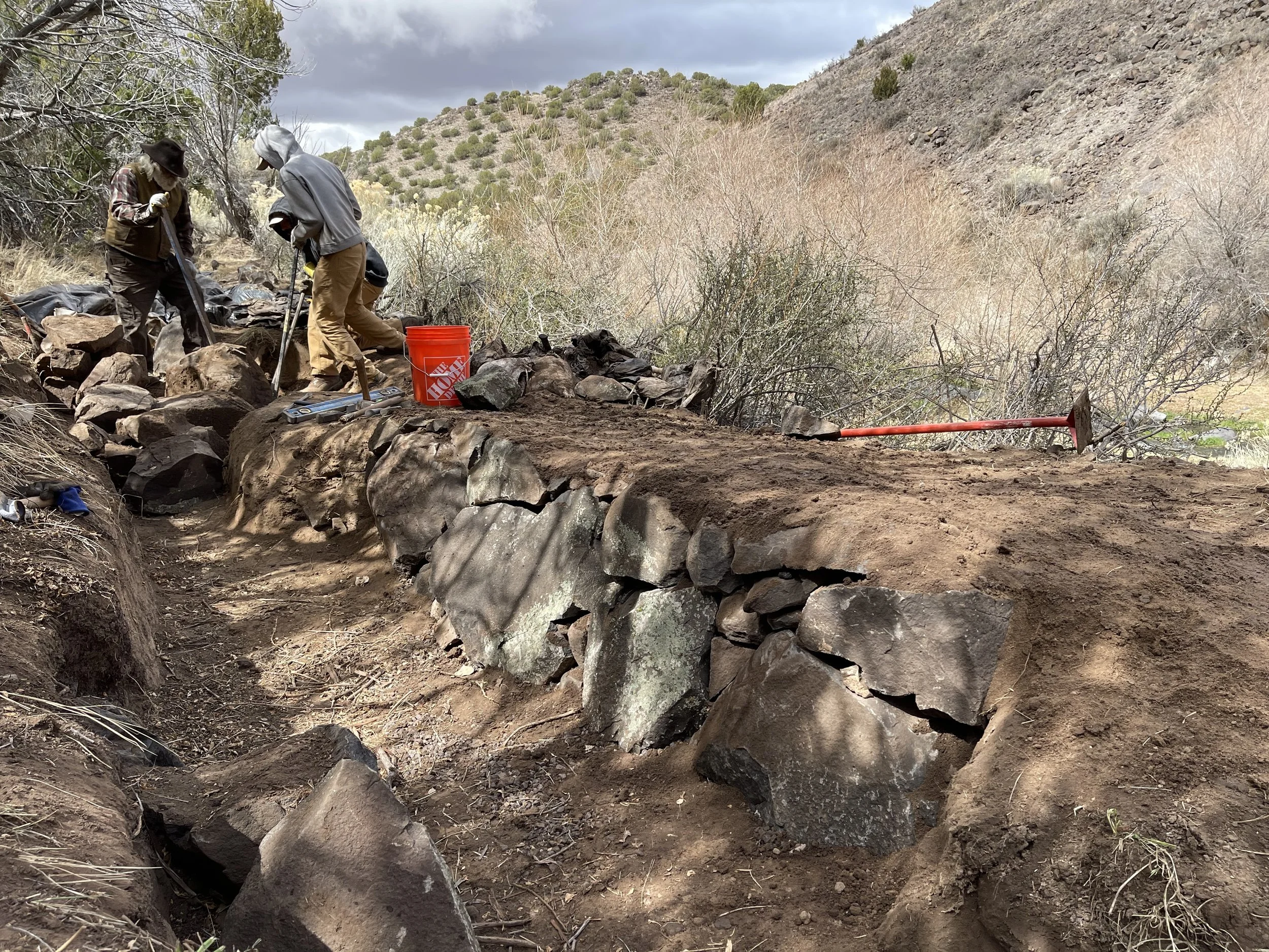 Just outside La Cienega, a village downstream from Santa Fe, the historic ranch house of the Rael family has been a focus of preservation and documentation work of Cornerstones for several years now. The Raels lived on the ranch for centuries; a sign at the driveways dates them and the acequia to 1718. One and a half miles long, the Rael Acequia has been upkept for lifetimes, and Cornerstones now leads the annual cleaning and stone masonry repairs to sustain it for the next century.