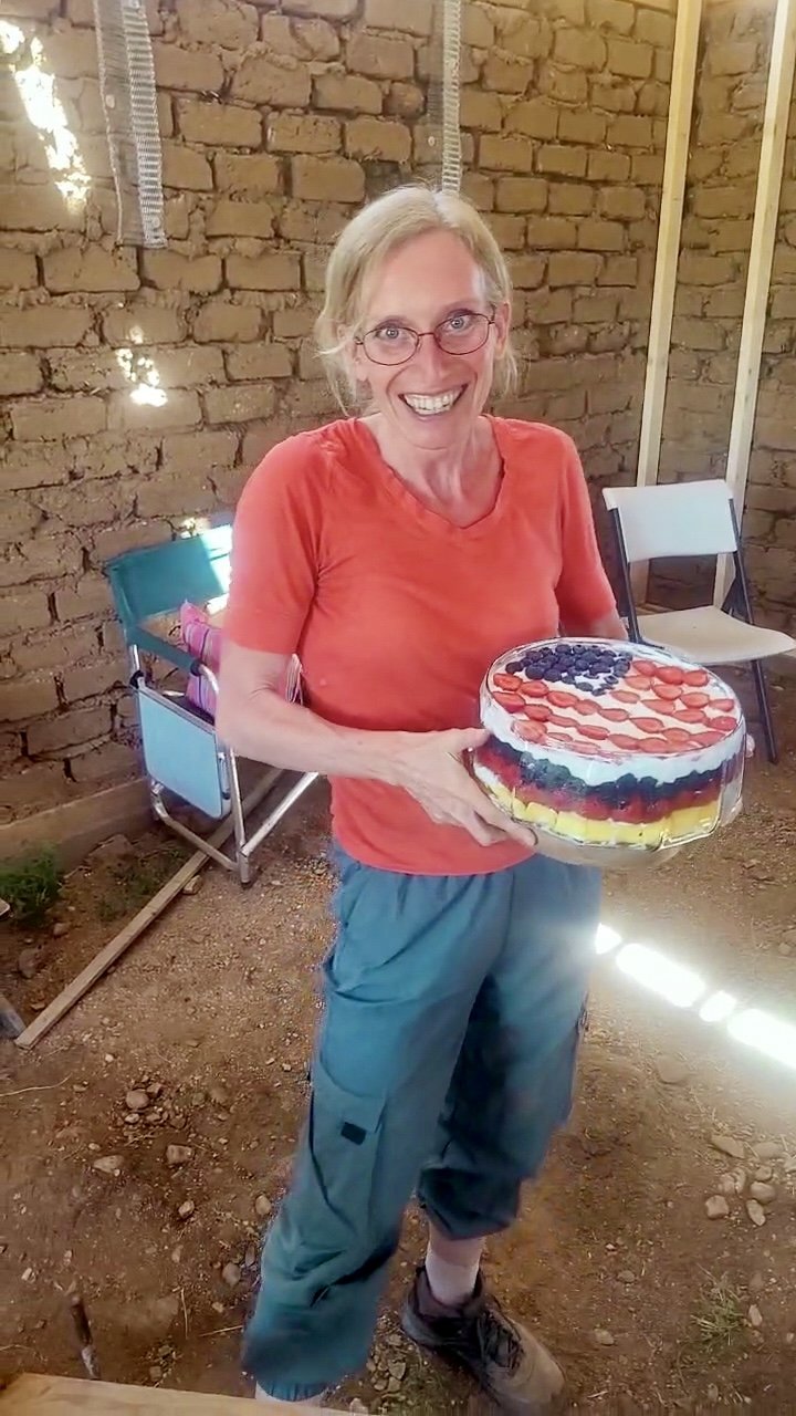 Friday and Saturday classes continue at Luna Community College where a dedicated cadre of committed students get some calluses and blisters assembling trusses to the bond beam, decking the roof and screwing down corrugated metal. With a roof over our heads, we have a perfect shelter to work inside when rain starts falling. We discover our orientation is perfect to catch a breeze and enjoy the coolness of adobe walls when the hot sun is blasting down. Empowerment and accomplishment shadows all.